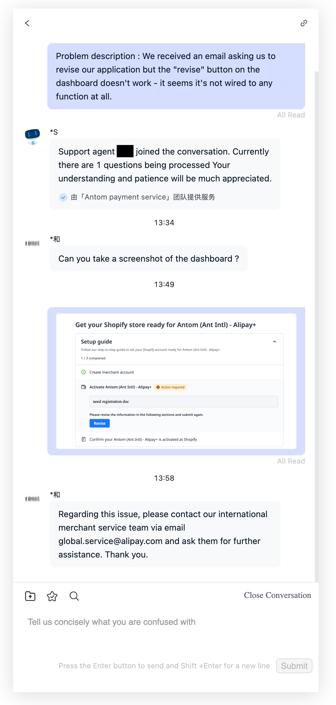 The guy was very straightforward. No polite shit talk. The first thing they said was, 'Can you take a screenshot of the dashboard?' We actually loved that; we initially thought it was a sign we were dealing with technical people instead of customer service. Then it turned out they were just untrained, as they simply referred us to an email address for what they called their 'international merchant service team'.
