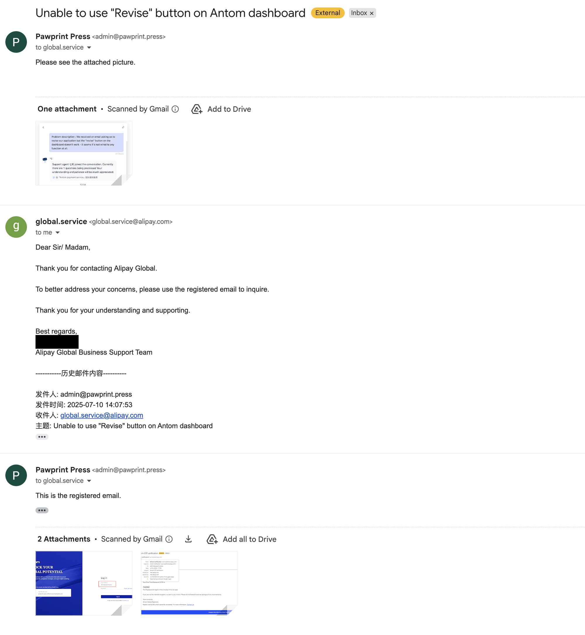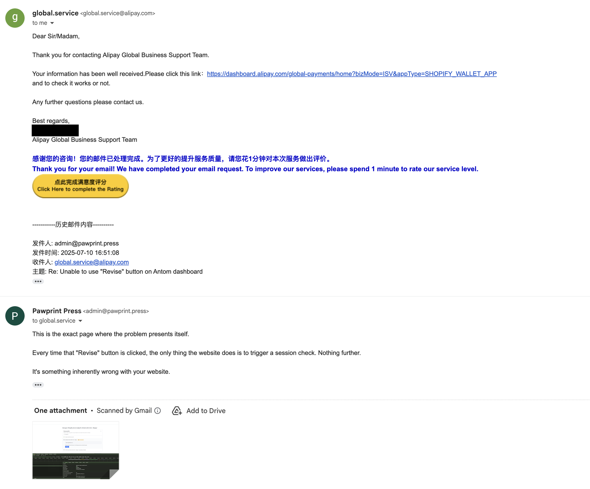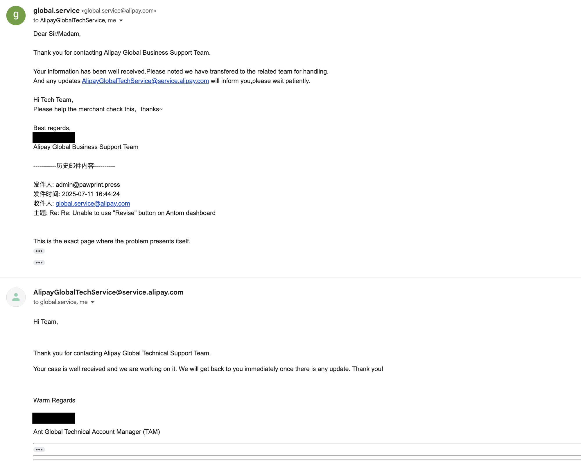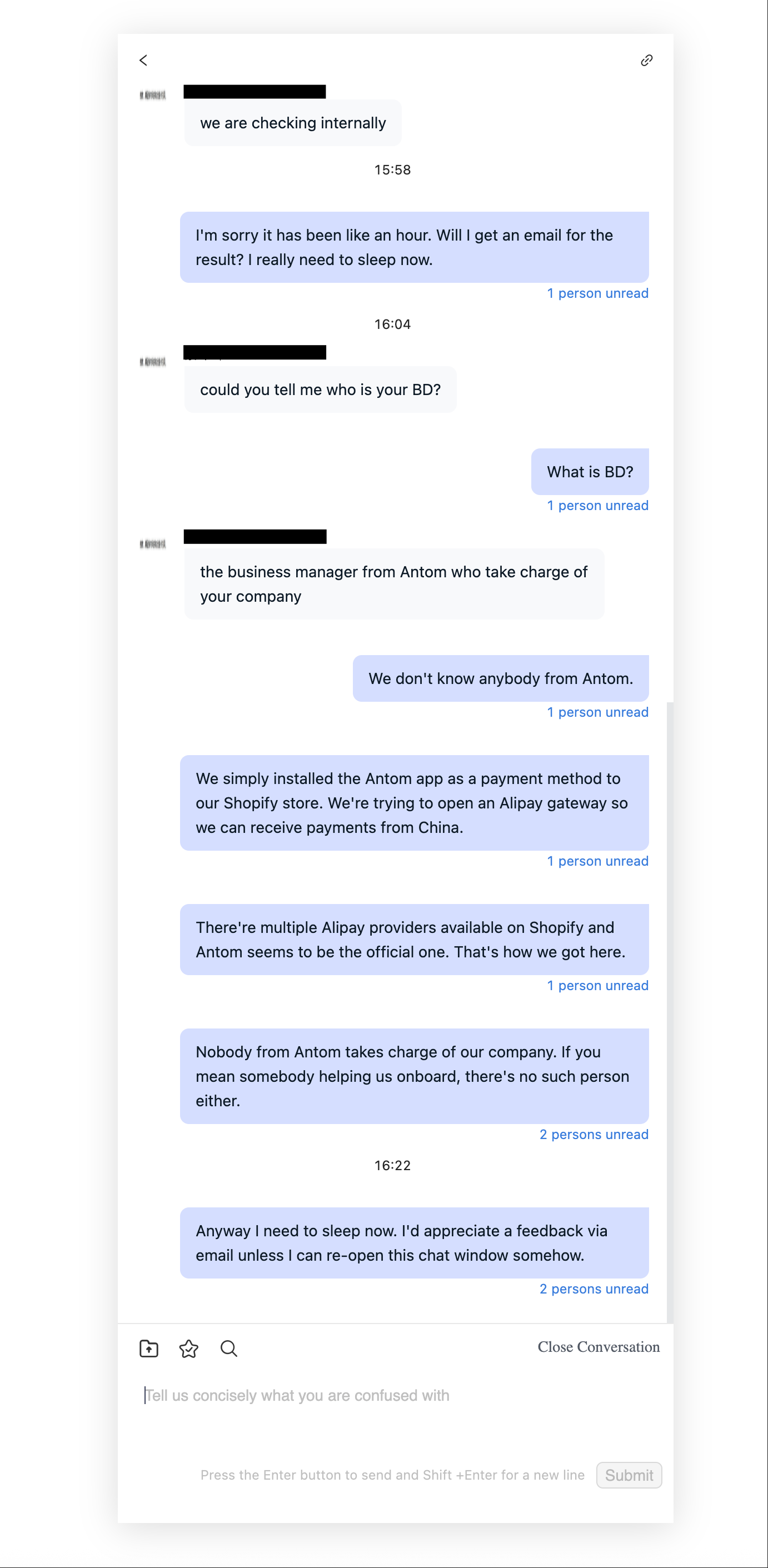 This further revealed that nobody was actually using this Antom website (corroborating our aforementioned theory about the website bug). Apparently, Alibaba hired a bunch of field promotion staff ("BDs") to sell Alipay to international merchants. So, their customer service staff was under the impression that every client is associated with a BD; otherwise, they couldn't understand how the client even got there.