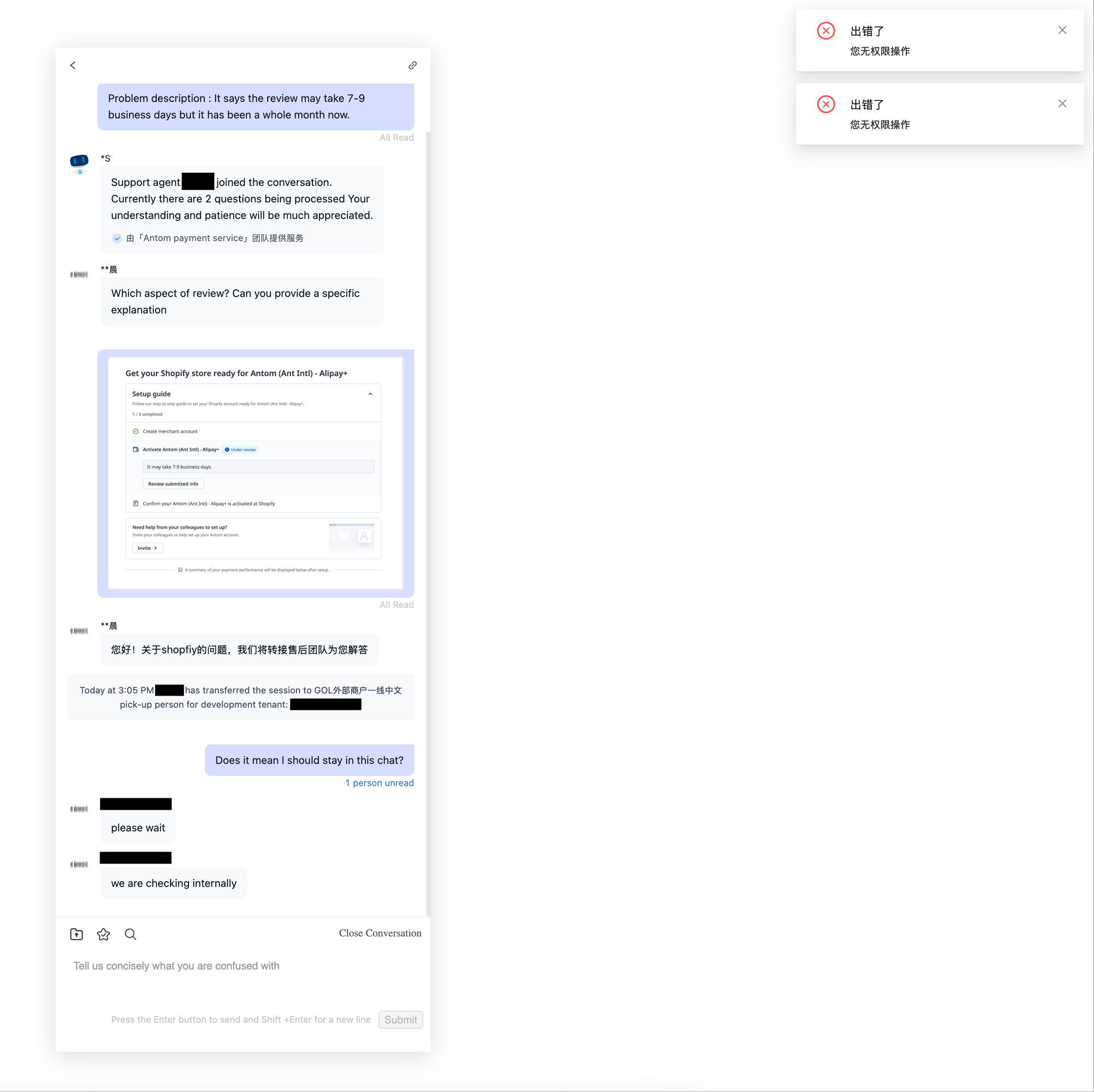 No idea how they have tampered with the online chat page since last time, because while the chat window remained functional, an error pop-up in the top-right corner kept displaying 'There's an error—You are not authorized to operate' in Chinese. Nevertheless, it didn't prevent us from communicating with the super dominant agent who ordered us to 'provide a specific explanation.'
